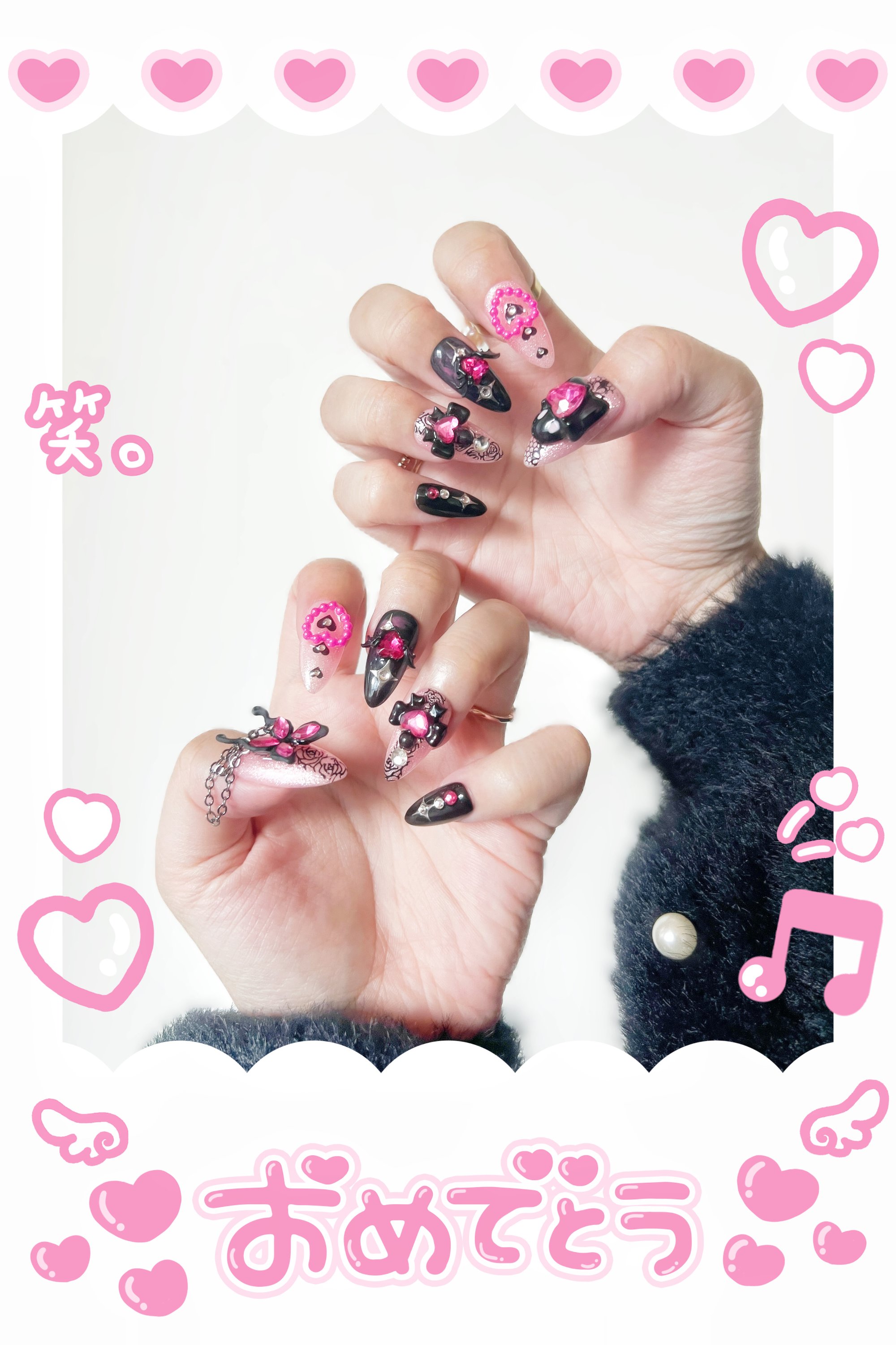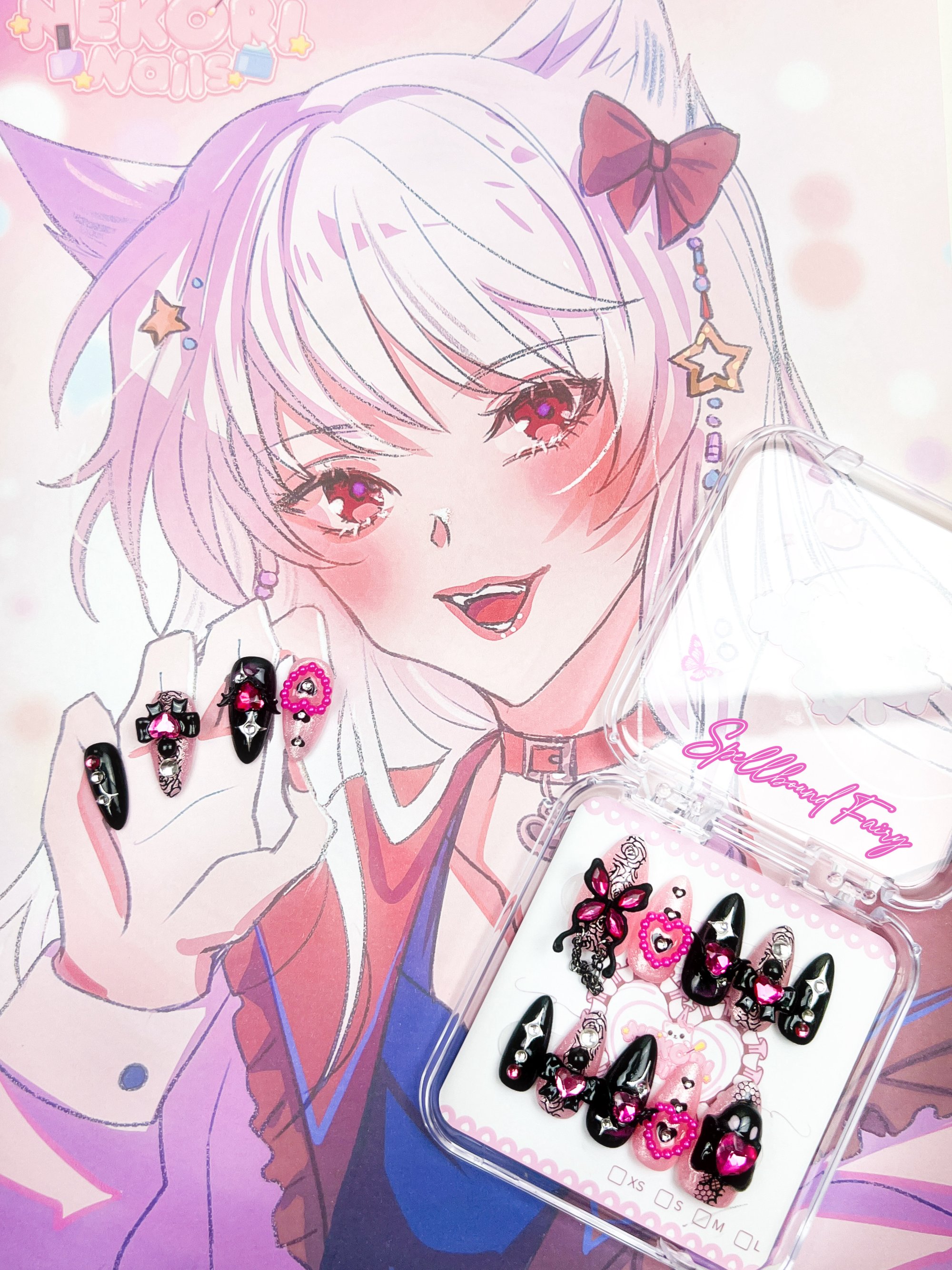 Nekori Nails style in “Spellfound Fairy” is a medium almond set that is the perfect combination of cute with a bit of an edge. Black and pink is one of my favorite color combos! This design works for spooky season and all year round if you’re wanting to channel your inner witch!